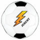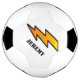 Personalized soccer ball, with graphics of a big lightening bolt decorating one side of the ball. Personalize the black text for yourself or as a great gift idea.