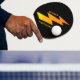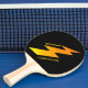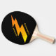 Black ping pong paddle, with graphics of a golden yellow lightening bolt and yellow text reading greased lightening. Personalize the yellow text to read what you want. Makes a great gift idea.