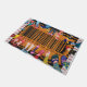 A painted doormat with a barcode pattern, with various feet and shoes standing on it.