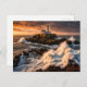 Waves break over the rocks, but the lighthouse stands fast as clouds gather in the evening on this beautiful postcard.