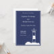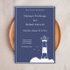 Elegant & simple navy blue wedding invitation with an illustration of a lighthouse for a marine and nautical theme wedding!