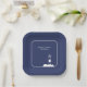 Elegant & simple navy blue paper plates with an illustration of a lighthouse for a marine and nautical theme wedding!