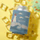This personalized can sleeve or can wrap is perfect for enjoying a cold one as you enjoy the ocean view from your beach house deck. It has a simple nautical style illustration of a lighthouse in red and cream or ivory. The lighthouse stands on a rocky shore with waves crashing below and cream coloured clouds in the sky. The graphic is set against a soft French blue background.
