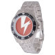Has heft and feel of expensive stainless steel quartz watches. Good band with safety catch.  I removed links, which is easy because engraved arrows show direction to push the linking pins. As always by this seller, the image (a railroad logo) is a perfect reproduction of my emailed image, and is precisely spaced and aligned.