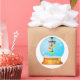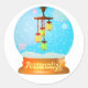 A snow globe featuring a rustic hanging chandelier hold Mason jars of fireflies. A unique snow globe.