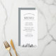 Un ensemble de menus personnalisés pour votre prochain événement sur le thème du mariage dans la belle ville de Houston, Texas. Il présente une illustration de style déco de l'horizon urbain. Ci-dessus, des spots pour votre sélection de menu unique. À l'envers, une couleur gris nickel douce avec un espace pour votre propre message unique pour remercier vos invités mariages. Ces menus mettront l'accent sur le dîner de répétition, la fête de fiançailles ou le dîner de réception de mariage. Les articles correspondants sont disponibles dans le complément qui peut inclure, assortis serviettes en papier, plaques en papier, cartes numériques de table et dessous de verre en papier.