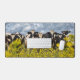 Ce tapis de bureau coloré comprend une rangée de vaches laitières Holstein noires et blanches qui se tiennent derrière une clôture en fil de fer barbelé avec des mauvaises herbes jaune au premier plan et un ciel bleu-gris turbulent au-dessus.