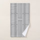 Cet ensemble de serviettes a un design art déco de lignes verticales avec des diamants et des cercles en argent sur un champ de gris.