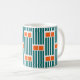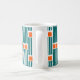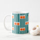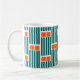 Cette tasse présente un design moderne du milieu du siècle composé de cinq lignes turquoises et de deux rectangles orange répétés à travers le design.