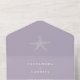 This wedding design is a perfect blend of elegance and beachy vibes. The main feature of the design is a small white starfish motif that sits gracefully in the centre of the lavender purple coloured background. The starfish motif is intricately designed and adds a touch of nature to the invitation. The typography used is classic white, which adds a touch of sophistication and ensures that the text is easy to read. The font style used is clean and modern, creating a timeless look that will never go out of fashion.