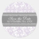 Save the Date envelope seals for wedding, in elegant light pastel lavender purple, grey and white classic floral damask pattern, the perfect addition to your save the date card envelopes, available in many matching wedding products. Contact us for a colour change request.
