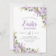 Invitations de fête de Pâques imprimées sur mesure et abordables. Ce joli design féminin a une bordure florale aquarelle avec fleurs violettes pastel et verdure. Personnalisez le modèle avec les détails de votre événement. Reverse side a un motif de bande d'aquarelle violet ou utilisez l'espace pour ajouter du texte et des photos supplémentaires. Cliquez sur Customiser pour choisir n'importe quelle couleur arrière - plan et modifier les polices de texte et les couleurs pour créer une invitation unique à dîner de Pâques.