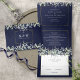 All in one navy blue tri-fold wedding invitation featuring sage and lilac greenery, elegant typography and your special photo. The invitation includes your celebration guest information details and a detachable RSVP card. Designed by Thisisnotme©