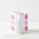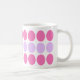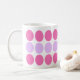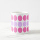 This designer mug features a girly mod pattern of lilack and pink green dots in a contemporary, geometric style.