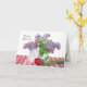 Lilac bouquet with single red tulip on checkered tablecloth.