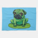 Cute green Pug resembling a frog sitting on a lilipad. Background colour can be changed.