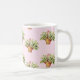 Cottage chic mug features wicker baskets of lily of the valley flowers on a pink and white polka dot background.