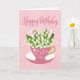 A quaint little pink teacup filled with a beautiful bunch of lily of the valley flowers along with the hand lettered words Happy Birthday on the top of card and the hand lettered words 57 today with love hearts on the tea cup. A sweet birthday card for someone special turning 57 today