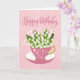 A quaint little pink teacup filled with a beautiful bunch of lily of the valley flowers along with the hand lettered words Happy Birthday on the top of card and the hand lettered words 61 today with love hearts on the tea cup. A sweet birthday card for someone special turning 61 today!