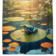 A vibrant frog sits peacefully on a lily pad in a tranquil pond surrounded by blooming flowers and lush greenery. Warm sunlight filters through, casting a gentle glow across the serene scene.