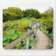Lily pond with a wooden boardwalk snaking over the water