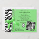 Lime green ribbon and silver pearls with black and white zebra stripes decorate this contemporary birthday party invitation. Upload your own photo to the funky zebra frame to further personalize the look. There is plenty of customizable text on this trendy invitation to add your party information. There is an additional zebra frame available for customizable text or you can delete this element if you prefer not to use it. We also have this design in various colours. Coordinating colours on the back of this plush invitation complete the look and makes this premium design perfect for almost any occasion. If at any time you need assistance customizing this product please feel free to contact us and we will be happy to help! Please note, there is no additional charge for this personalized service.