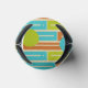 This can cooler has a mid-century modern design of repeating rectangles in lime green, cinnamon brown, and turquoise with circles layered on top.