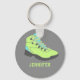 This keychain features an illustration of a hiking boot in lime green and aqua blue set against a grey background and is ready to be personalized with a name below in matching green lettering.
