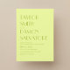 The design features a captivating pastel lime green background that exudes tranquillity and new beginnings. Its minimalist aesthetic radiates simplicity and sophistication, making it an ideal choice for couples seeking a refined and uncluttered look. The darker green fonts, reminiscent of classic letterpress printing, add a touch of nostalgia, creating a harmonious blend of vintage and modern elements.