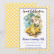Invitation card for a birthday celebration, featuring a picturesque coastal Italian scene reminiscent of the Amalfi Coast. In the foreground, there is a bottle and a glass of limoncello surrounded by fresh lemons and green leaves on a rustic wooden board. The background depicts charming colorful Mediterranean houses overlooking the sea. The card has a cheerful yellow gingham border and elegant blue script. The text reads "Sweet Celebration, your own text and provides details for the date, location, and RSVP information.