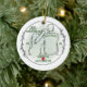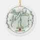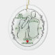A sweet ornament portraying a couple from behind as a woman with a ponytail leans her head onto a man’s shoulders. The ornament reads, “Our First Christmas Married 2024 Quentin and Jacquelyn,” with personalization for the couple. Married appears on the back of the man’s shirt. A soft greenish watercolor splash appears behind the couple. On the back of the ornament, you will find the wreath and a small red heart. There is a text box for you to type a sweet note or perhaps leave some details about your life together. If you give this as a gift to the lovely couple, you can leave a note of encouragement as they embark on this new journey.