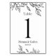 A minimalist white wedding line art floral table number featuring a hand-drawn line art rendition of a rose, buds and leaves.
