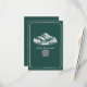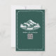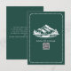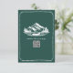 Wedding RSVP with mountains and evergreen and canoe illustration with scalloped border. Background is emerald. Personalize the text and QR code.