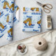 Line dance gift wrapping paper with a cowboy boots and music symbols behind them and the text "Boot Scootin". This design is available in a couple of different colours.