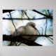 A white bird sits on a branch, high up in a tree.