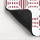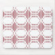 This mouse pad has a mid-century modern design of cranberry vertical lines with hexagons strung horizontally on a field of white.