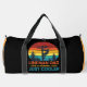 This black duffle bag features a striking retro-style graphic of a lineman working on a utility pole against a sunset with mountains and pine trees. "LINEMAN DAD" curves above, and "LIKE A NORMAL DAD JUST COOLER" is below, celebrating their unique role. This design is perfect for proud lineman dads and their families. Edit colour of the bag caps and body in the Design tool to your favored colours.