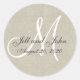 Linen Monogram Wedding Initial Bride Groom Favour Sticker or for Wedding Invitation Envelope Seals. Fully Customizable. Elke Clarke©2009. Printed photo effect beige linen background with white monogram and black script text. Perfect for a rustic wedding theme.