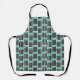 This apron has a mid-century modern design made of five black lines and two turquoise rectangles repeated across the design.