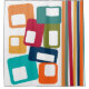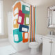 This shower curtain has a mid-century modern design of lines and rectangles in retro shades of orange, gold, cranberry, teal, green, blue, turquoise, and green.