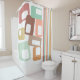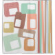 This shower curtain has a mid-century modern design of lines and rectangles in retro shades of red, yellow, orange, blue, green, brown, and pink.