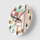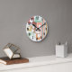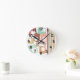 This wall clock has a mid-century modern design of lines and rectangles in retro shades of red, yellow, orange, blue, green, brown, and pink.