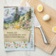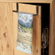 Blue damask kitchen towel/calendar towel. Proverbs 16:9 “In their hearts humans plan their course, but the LORD establishes their steps." Hourglass with Alpine scene, pine trees, daisies, bird and scripture scroll.