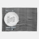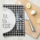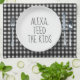 Alexa electronic device command to "feed the kids" on a white dinner plate with a black and white gingham pattern.