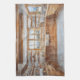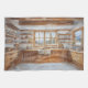This alpine chalet kitchen watercolor features warm wooden cabinetry, open shelving, and a farmhouse sink set beneath a wide window overlooking snow-dusted pine forests and mountain peaks. Soft watercolor washes and natural tones create a cozy, winter-inspired kitchen scene ideal for culinary spaces.