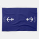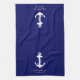 Serviettes de cuisine bleu marine sur le thème nautique pour votre bateau avec une illustration blanche classique d'une ancre et le nom et l'emplacement de votre bateau dans une typographie blanche simple et élégante.