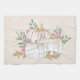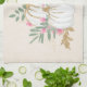 Une serviette de cuisine aux citrouilles blancs d'aquarelle fantaisie aux accents de parties scintillant en faux or. Entouré de feuilles verts et de fleurs sauvages roses.