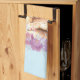 Une serviette de cuisine avec un joli tableau aquarelle d'une mère lion tenant son bébé. Un joli bouquet fleuri violet en dessous ajoute une touche douce à cette image douce et adorable. Arrière - plan bleu clair.