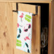 Une serviette de cuisine comportant un motif des flamants roses, des bascules électroniques vertes, et des lunettes de soleil roses et bleues.