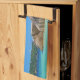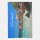 Une serviette de cuisine avec une photo d'une plage bleu turquoise de l'océan avec de gros rochers éparpillés le long de la côte. Région tropicale claire et ensoleillée.